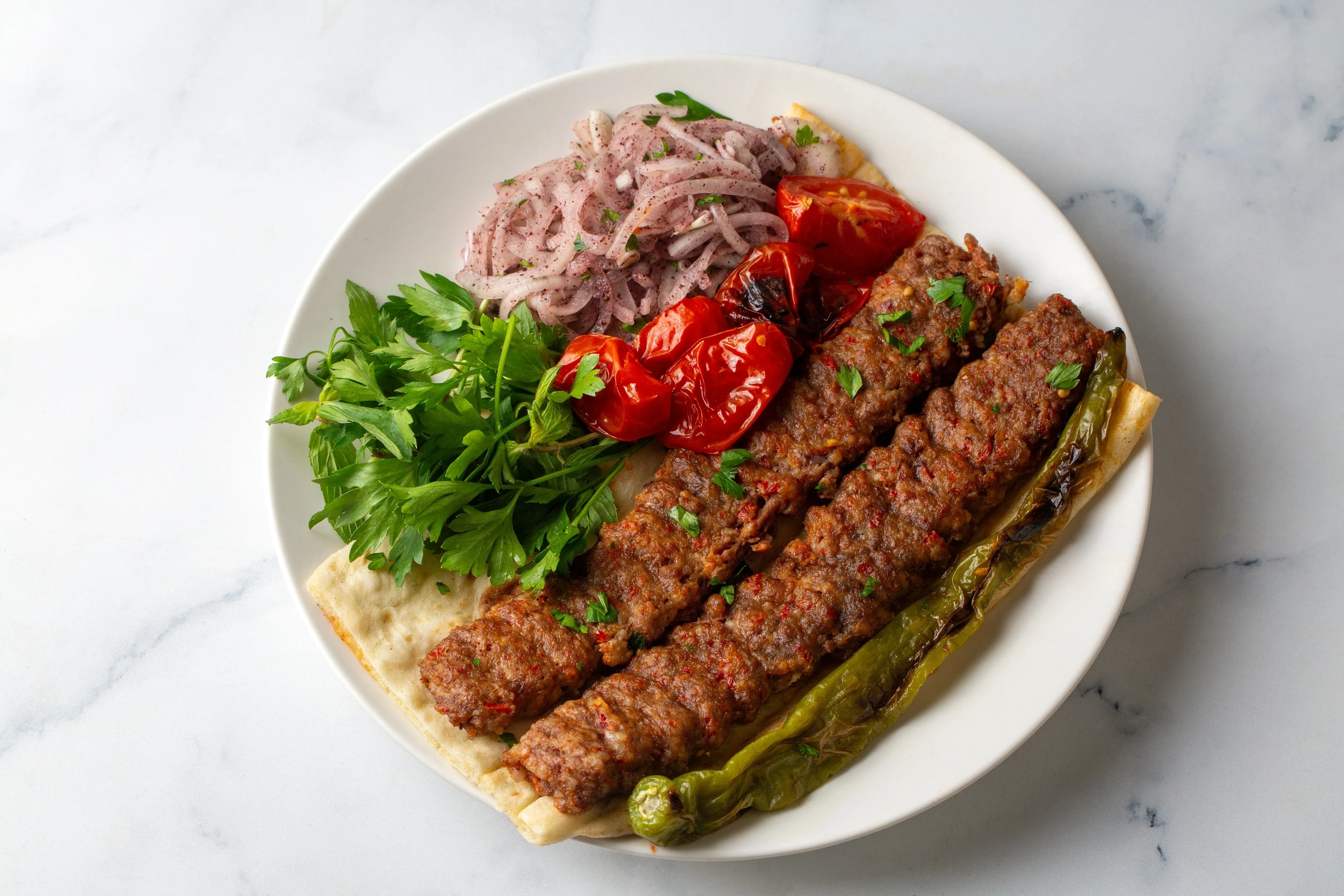 Подается с маринованным луком, шашлычным соусом и лавашом.