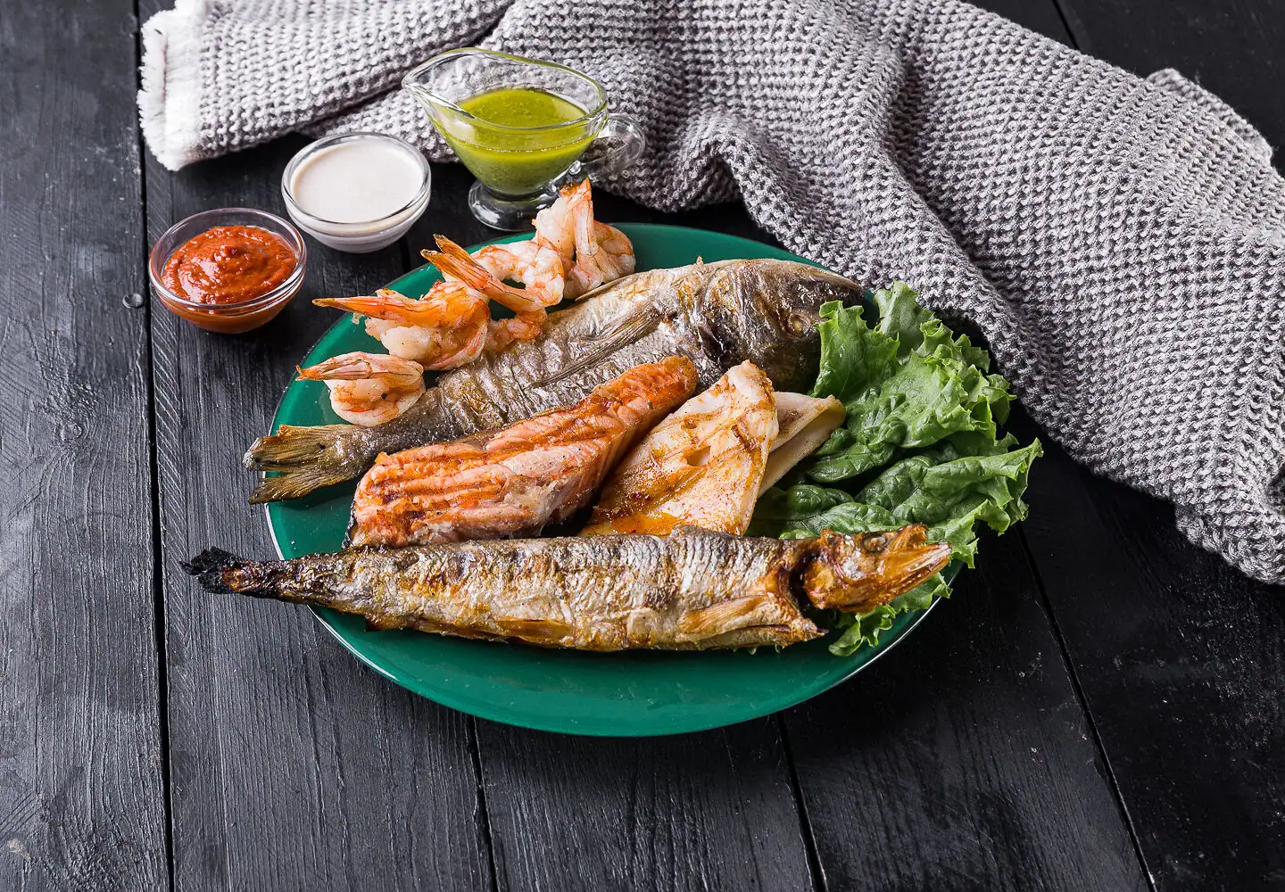 Тигровые креветки, стейк семги, дорадо 1 шт.