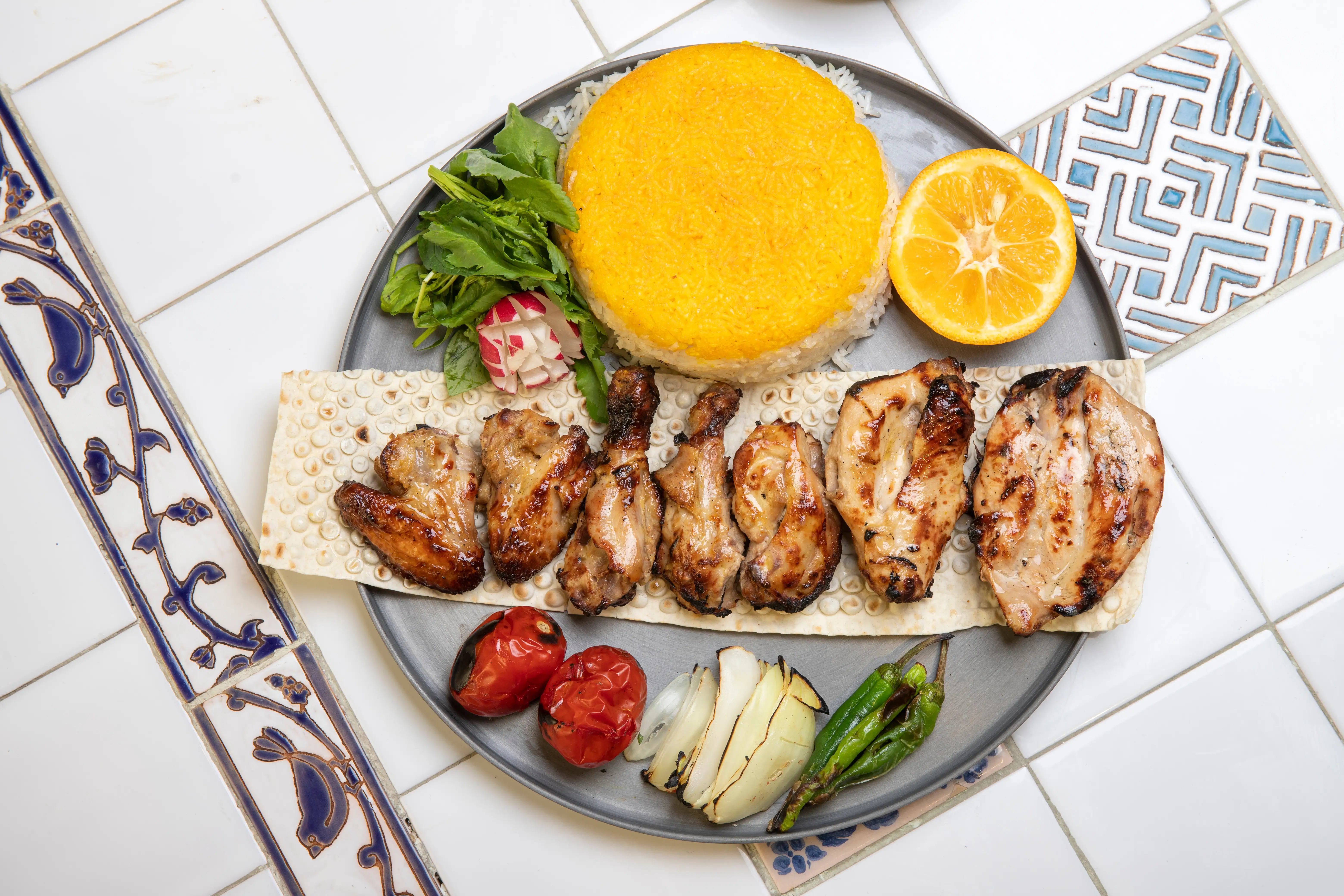 Подается с маринованным луком, шашлычным соусом и лавашом.