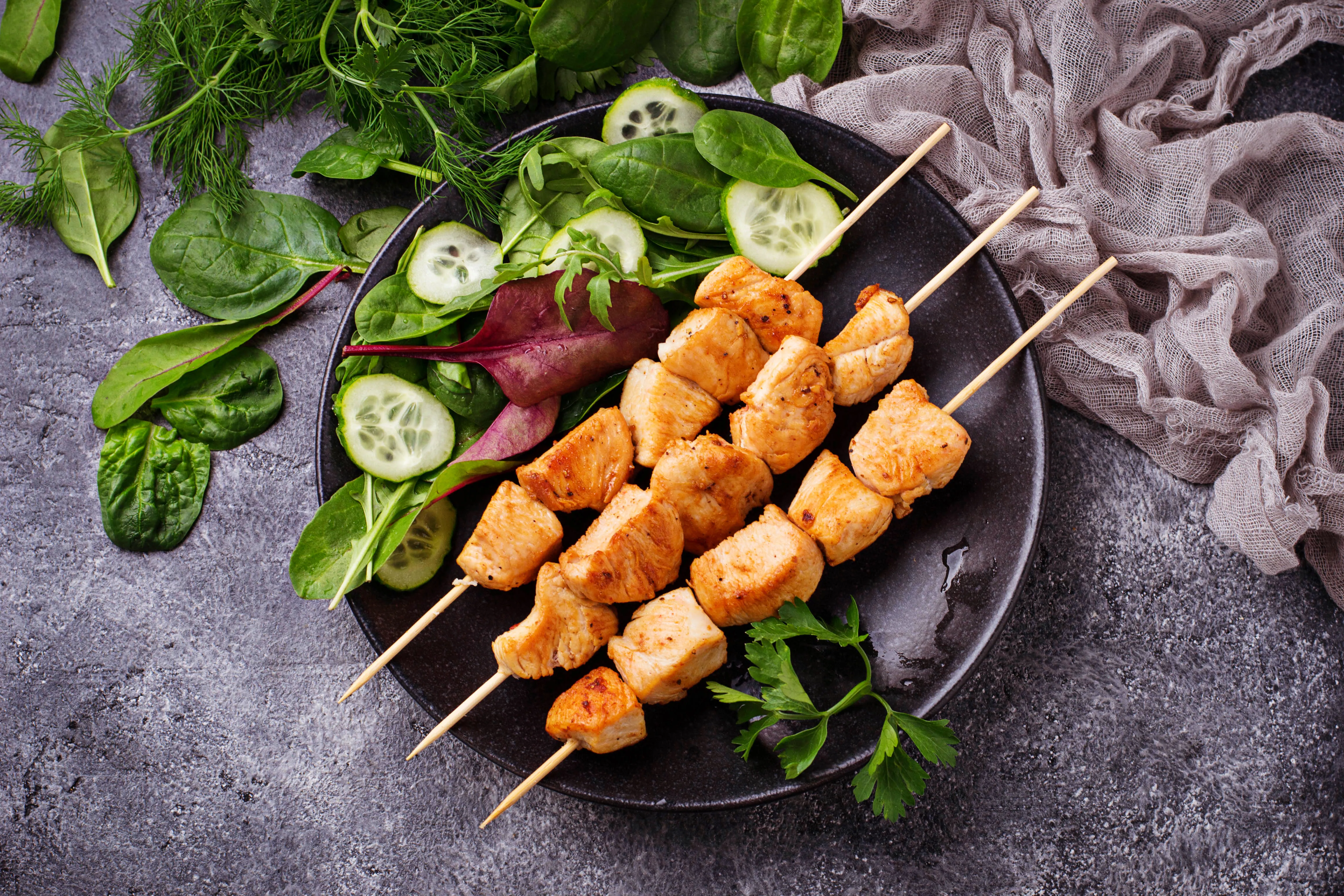 Подается с маринованным луком, шашлычным соусом и лавашом.