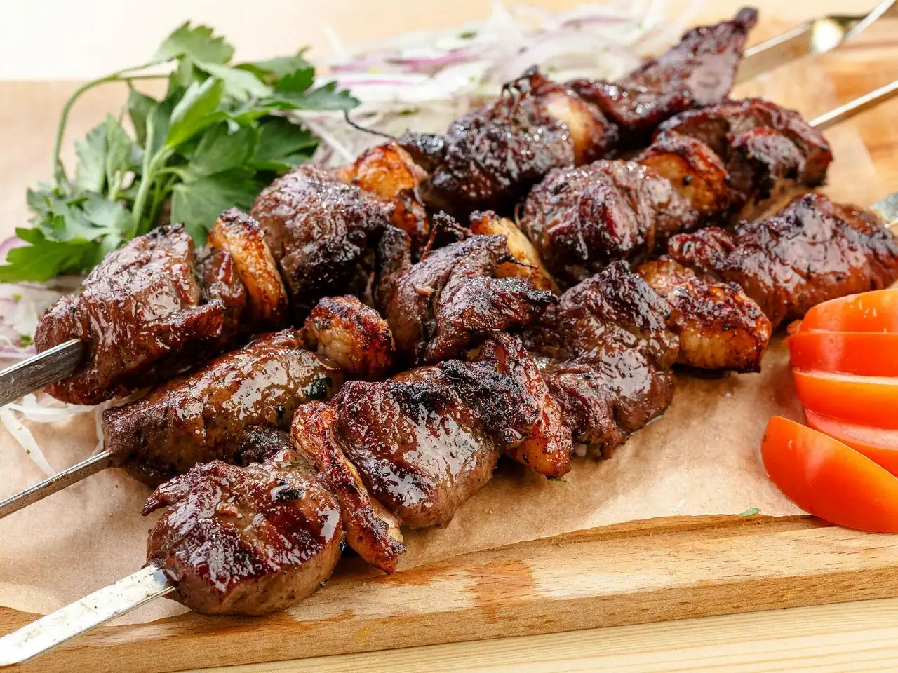 Подается с маринованным луком, шашлычным соусом и лавашом.
