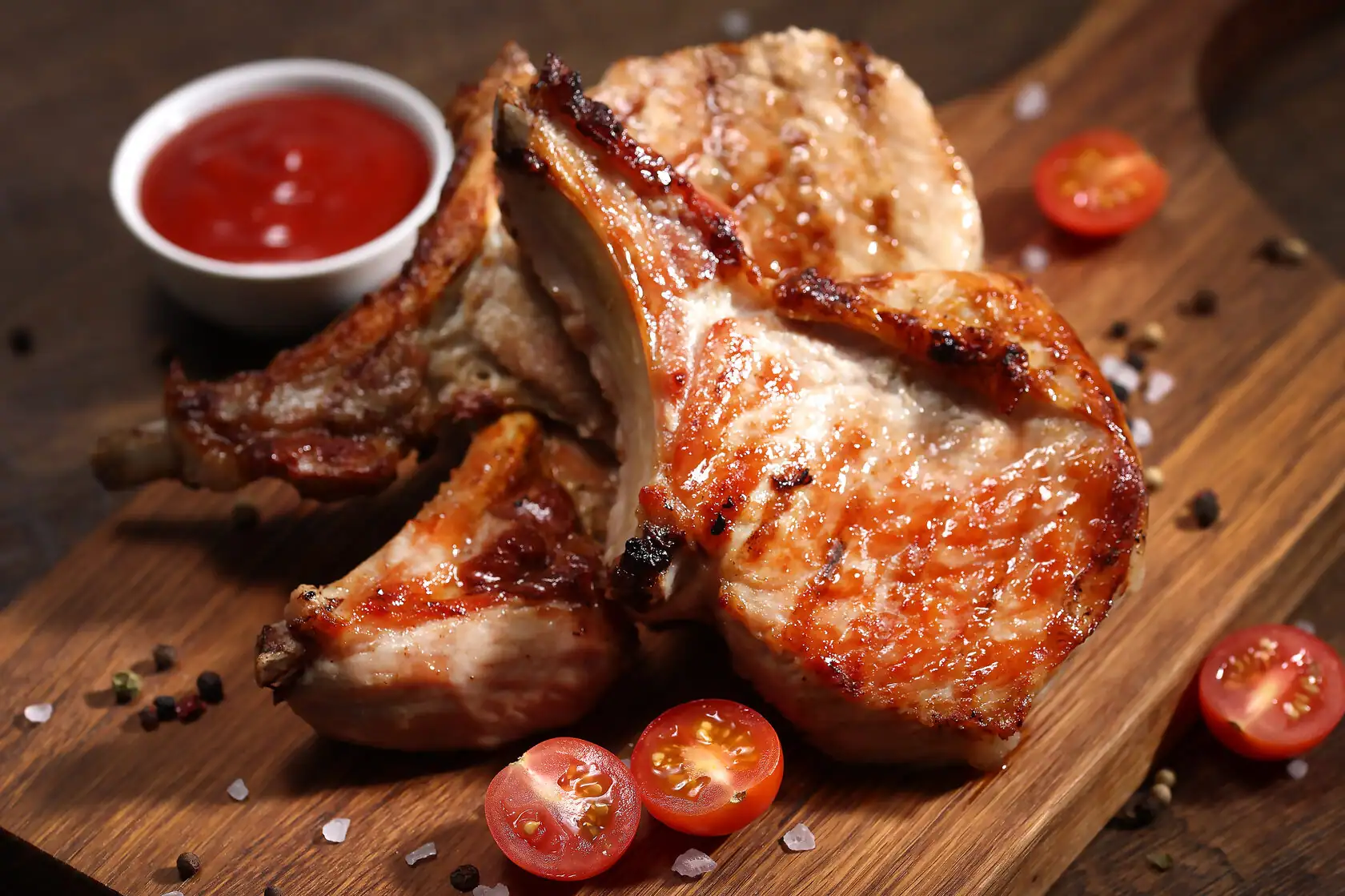 Подается с маринованным луком, шашлычным соусом и лавашом.
